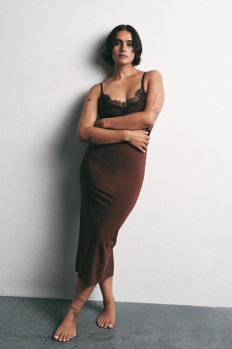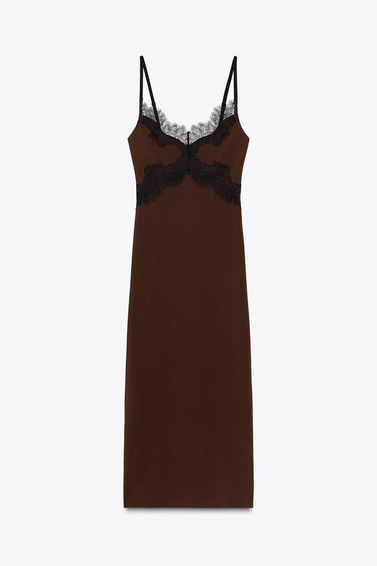 ZARA КОМБИНИРОВАННОЕ КРУЖЕВНОЕ ПЛАТЬЕ, КОРИЧНЕВЫЙ