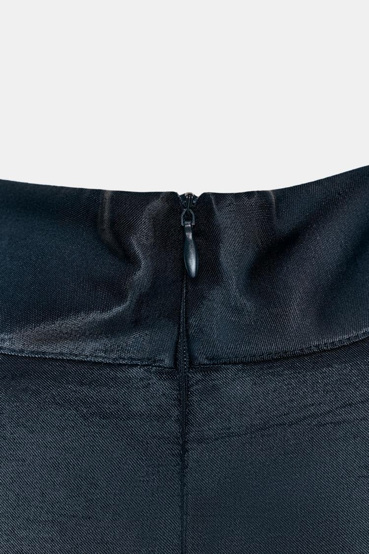 Короткое платье с высоким воротником и рукавами без прорезей. Деталь из передних складок. Низ с передним разрезом и кружевом. Потайная застежка-молния в шве сзади.