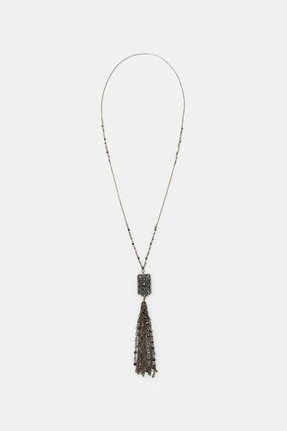 Комбинированное ожерелье из металлических звеньев и цветных бусин. Прямоугольная подвеска с блестками и бахромой. Застежка-карабин.