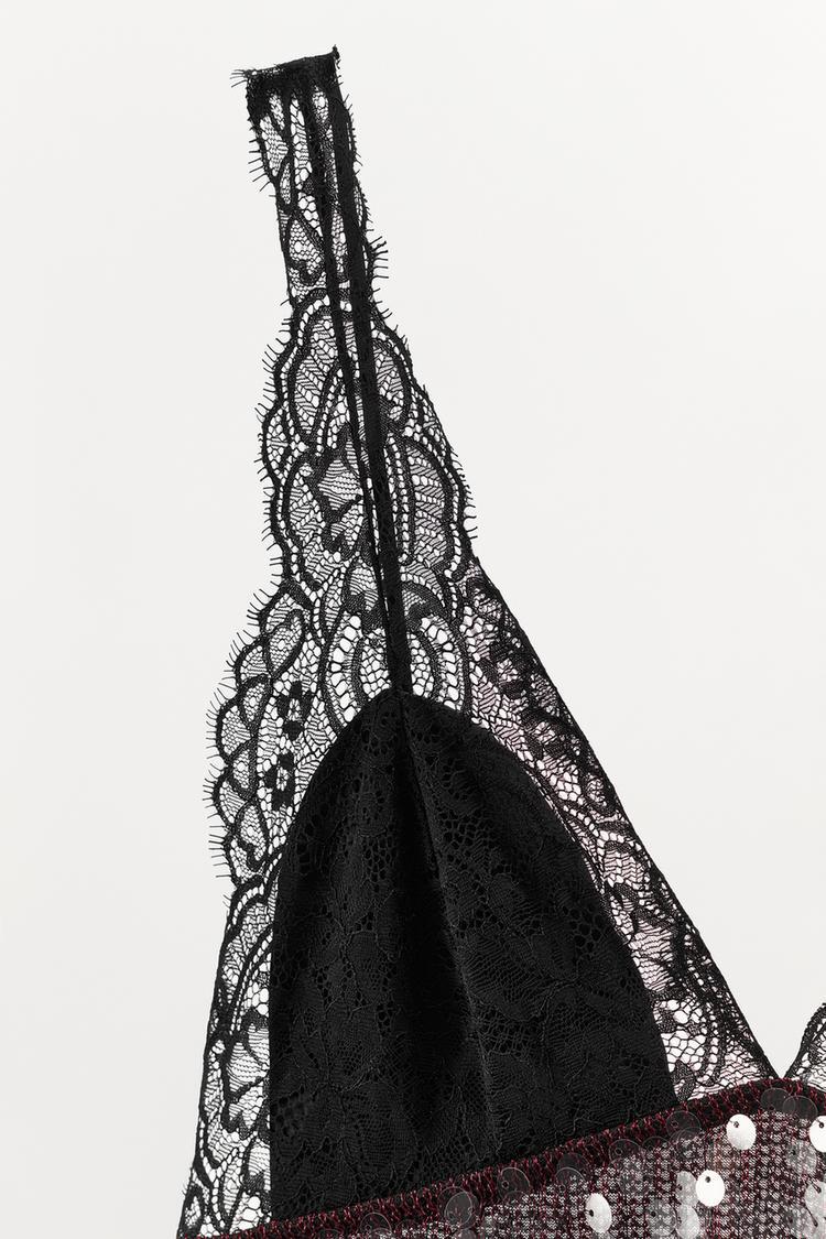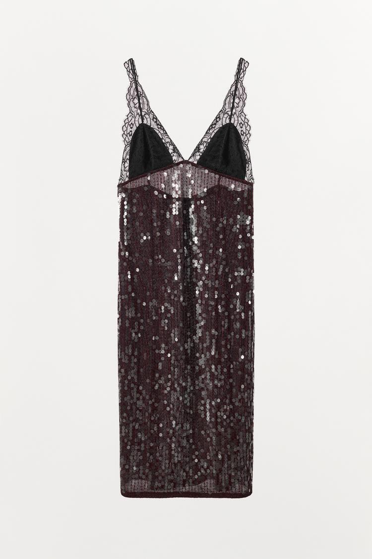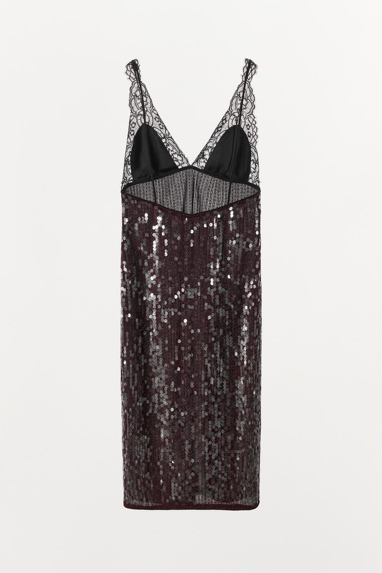 Комбинированное платье миди с V-образным кружевным вырезом и тонкими бретелями. Деталь из ткани с люрексом и контрастными пайетками. Потайная застежка-молния сбоку.