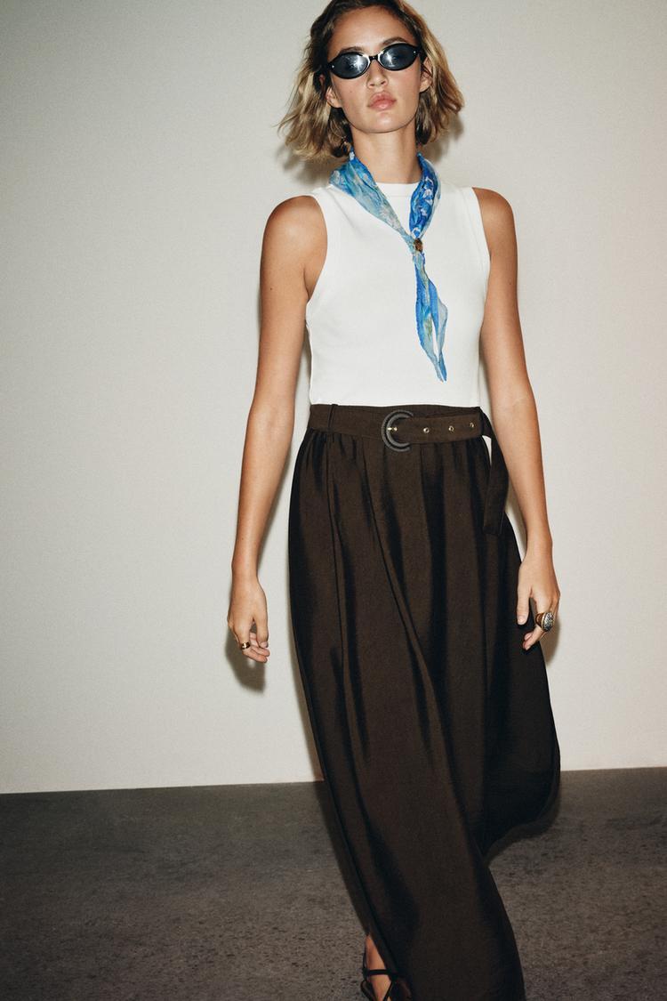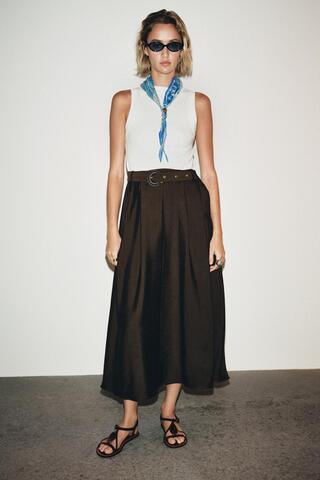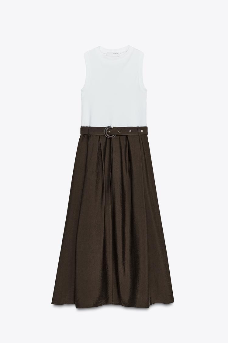 ZARA КОМБИНИРОВАННОЕ ПЛАТЬЕ-МИДИ С РЕМНЕМ, КОРИЧНЕВЫЙ/БЕЛЫЙ