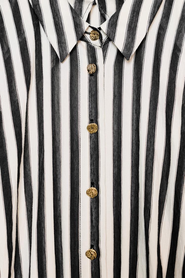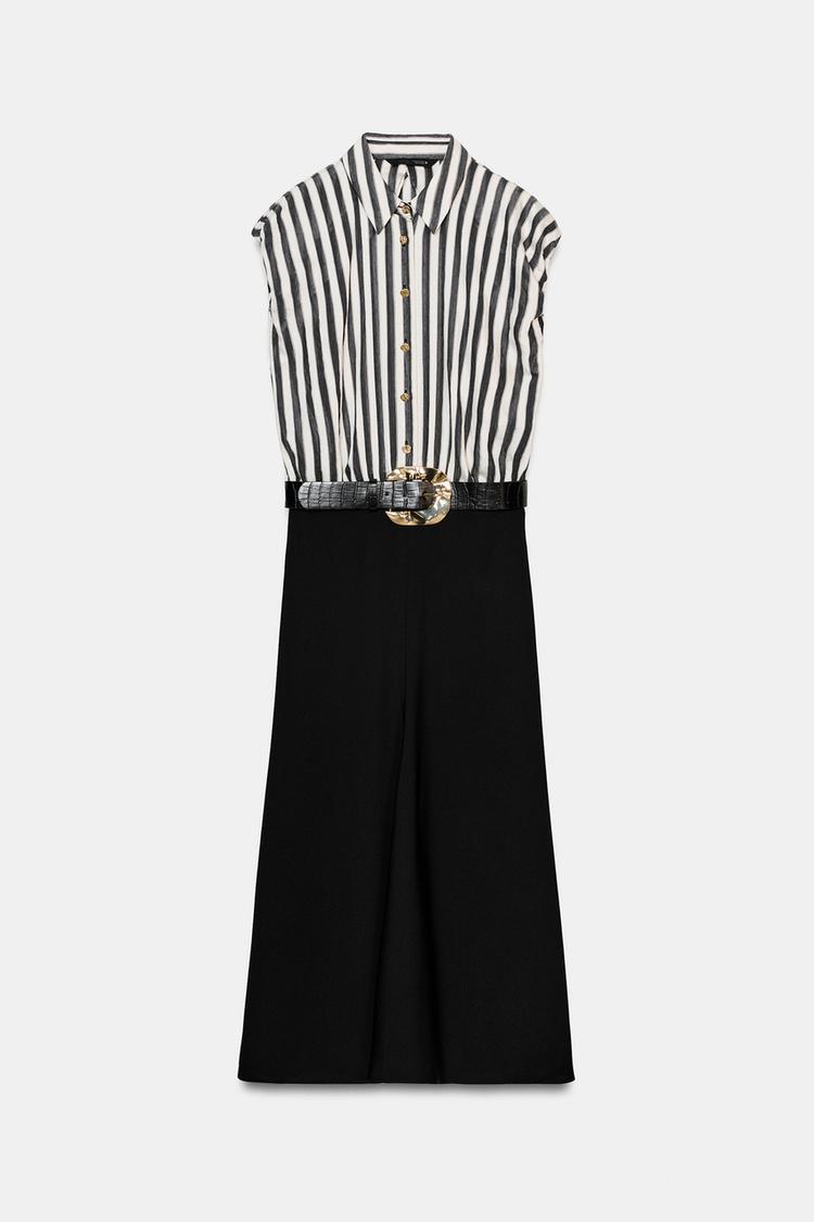 ZARA КОМБИНИРОВАННОЕ ПЛАТЬЕ МИДИ В ПОЛОСКУ С РЕМНЕМ, ЭКРЮ/ЧЕРНЫЙ