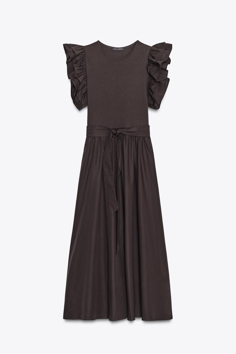 ZARA КОМБИНИРОВАННОЕ ПЛАТЬЕ С ВОЛАНАМИ, ШОКОЛАДНЫЙ