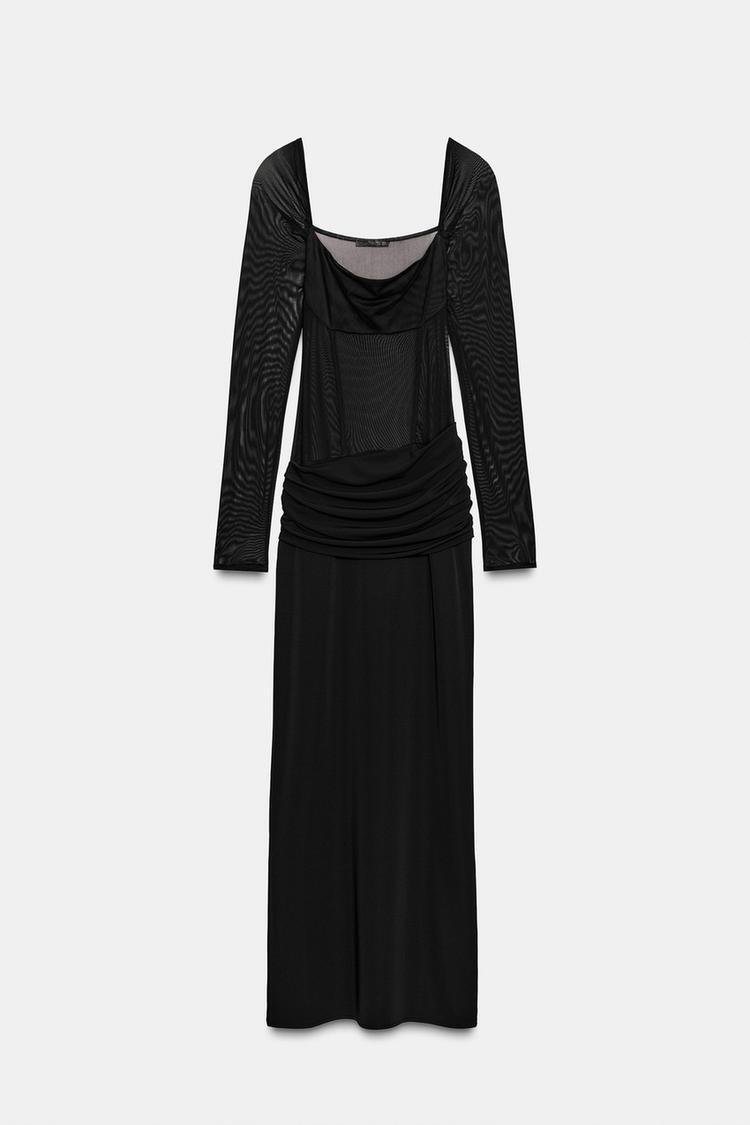 Длинное полупрозрачное платье с квадратным вырезом и длинными рукавами. Деталь из комбинированной ткани в тон и драпированная ткань на талии. Прямой подол.