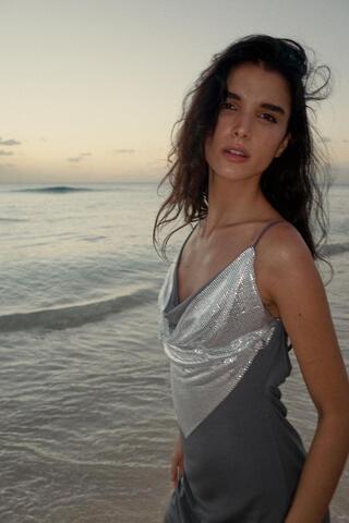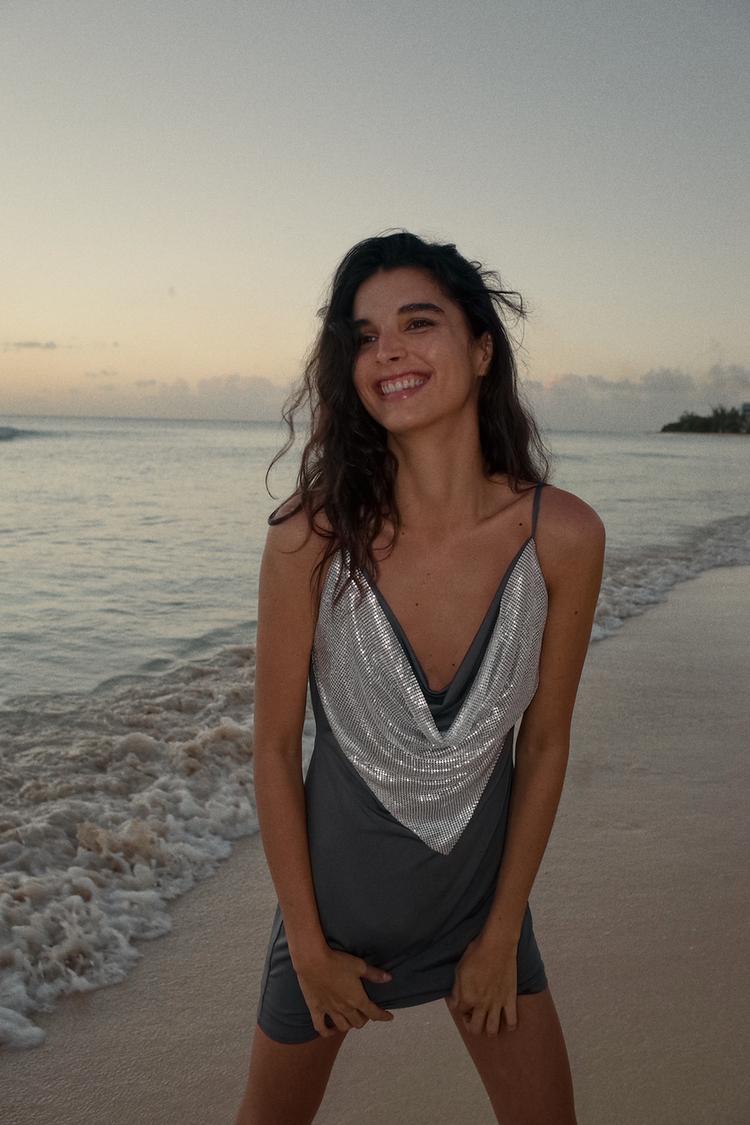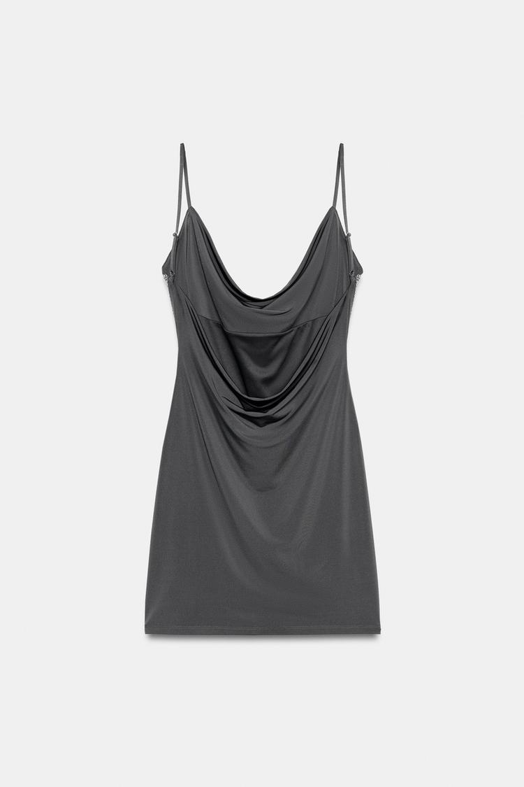 Мини-платье с драпированным вырезом и регулируемыми бретелями. Открытая спина. Деталь из контрастной сетчатой ткани.
