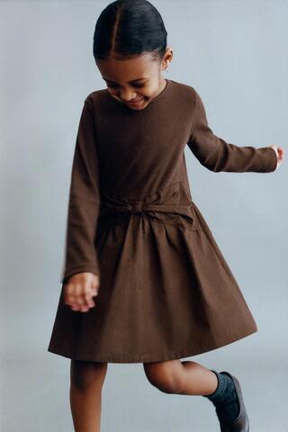 Платье с круглым вырезом и длинными рукавами. Комбинированный подол с бантом спереди. 100% хлопок.