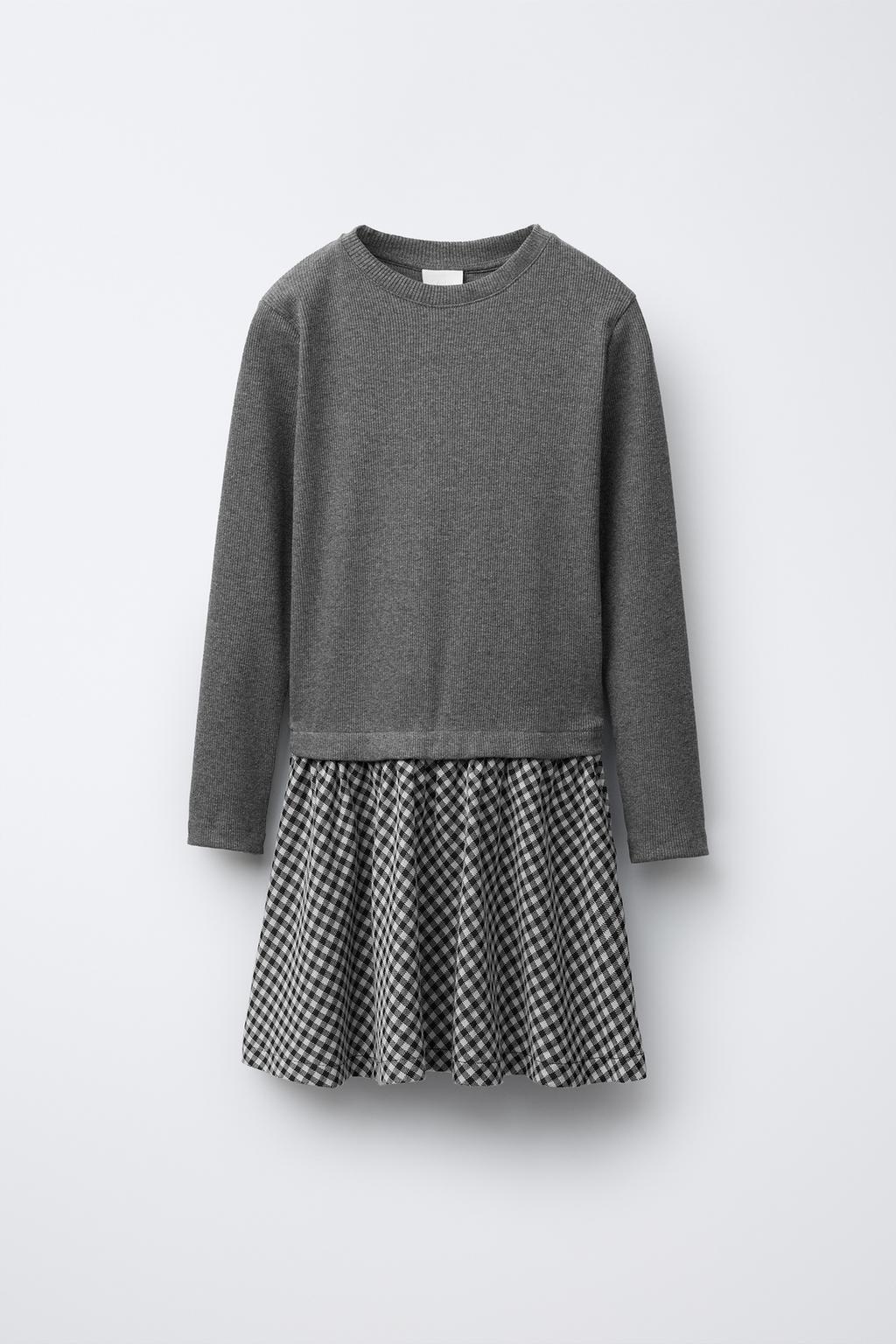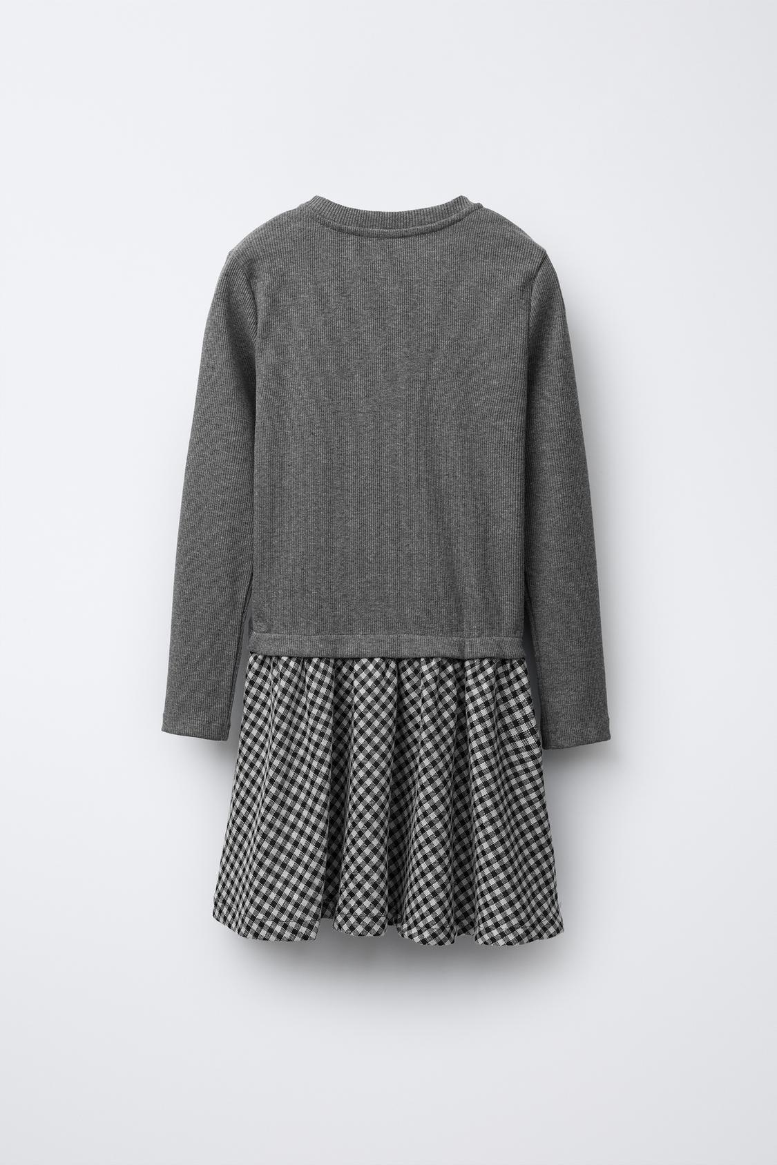 Комбинированное платье в рубчик с круглым вырезом и длинными рукавами. Юбка с клетчатым принтом.