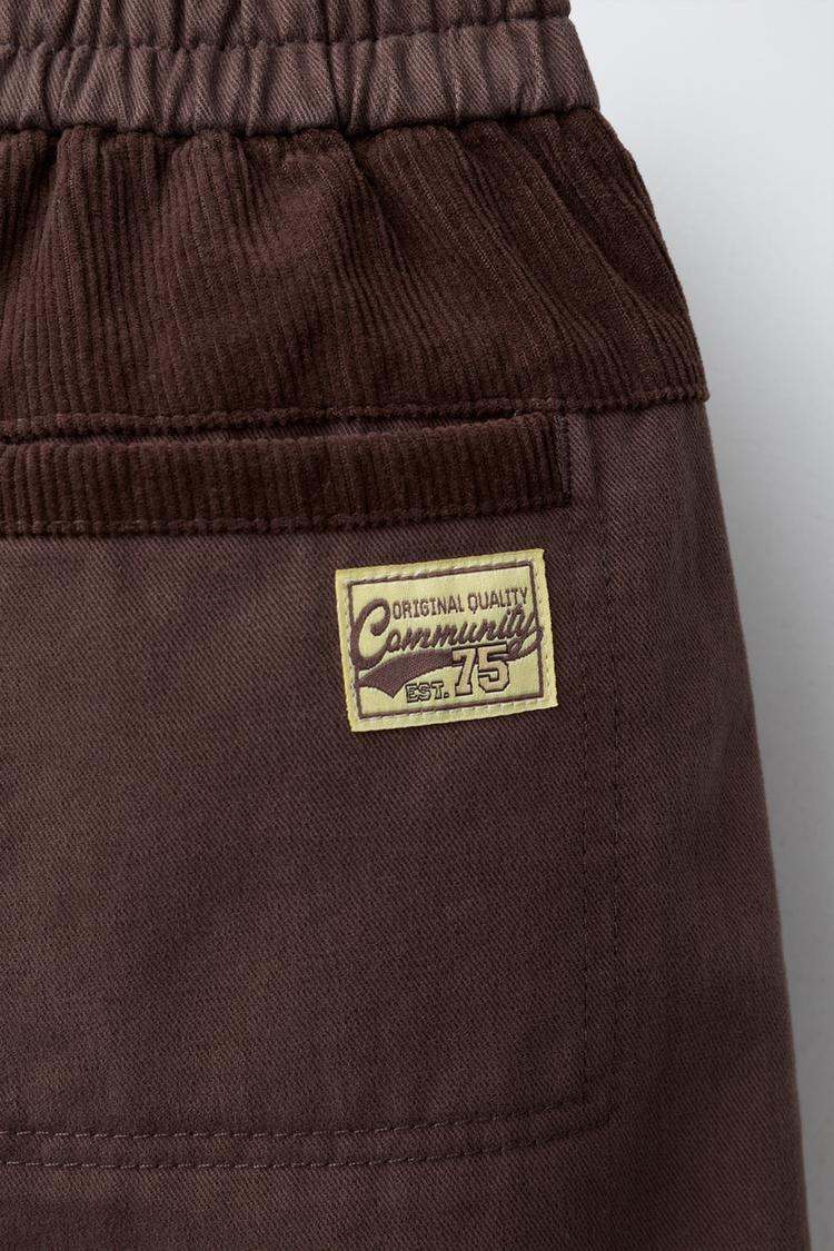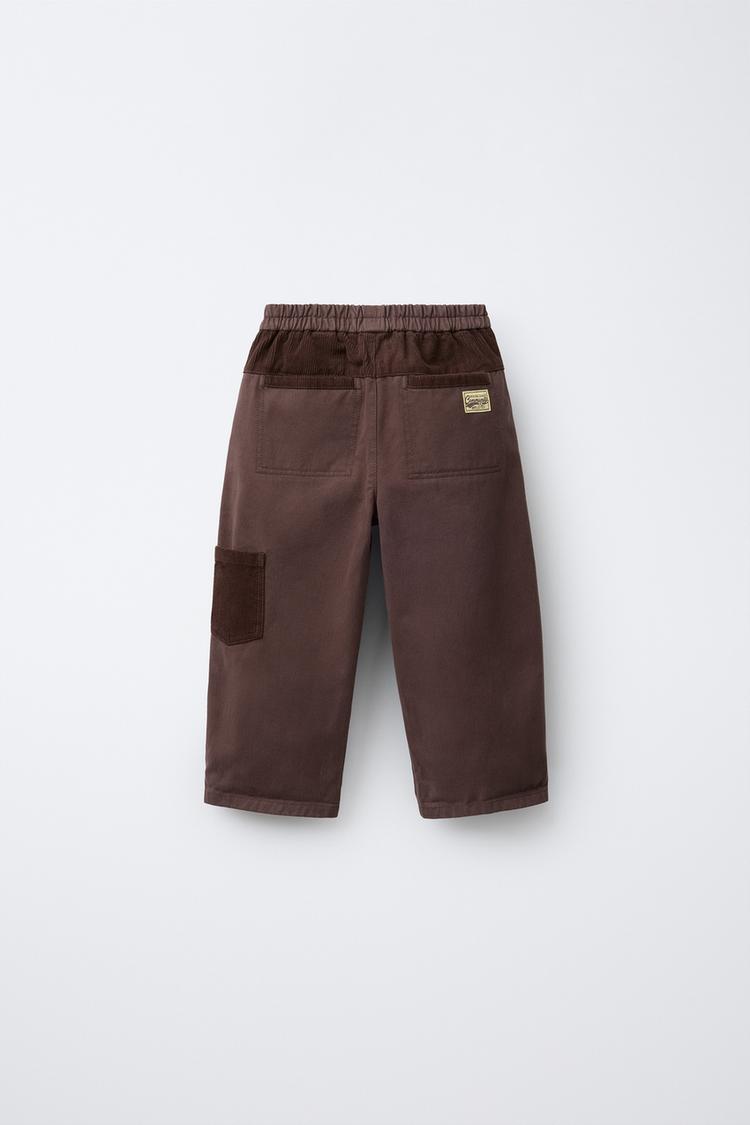 Брюки-бананы с эластичным поясом. Передние карманы и накладные карманы сзади. Комбинированные вельветовые нашивки.