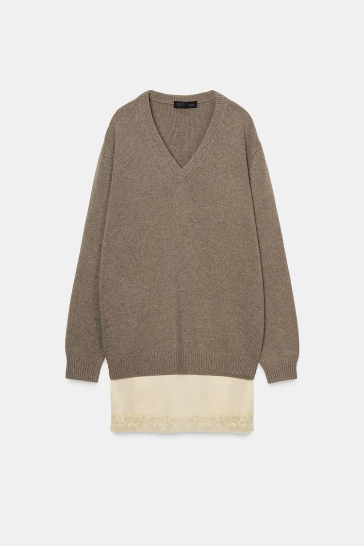 ZARA КОМБИНИРОВАННЫЙ СВИТЕР ИЗ ШЕРСТИ, СВЕТЛЫЙ СЕРО-КОРИЧНЕВЫЙ