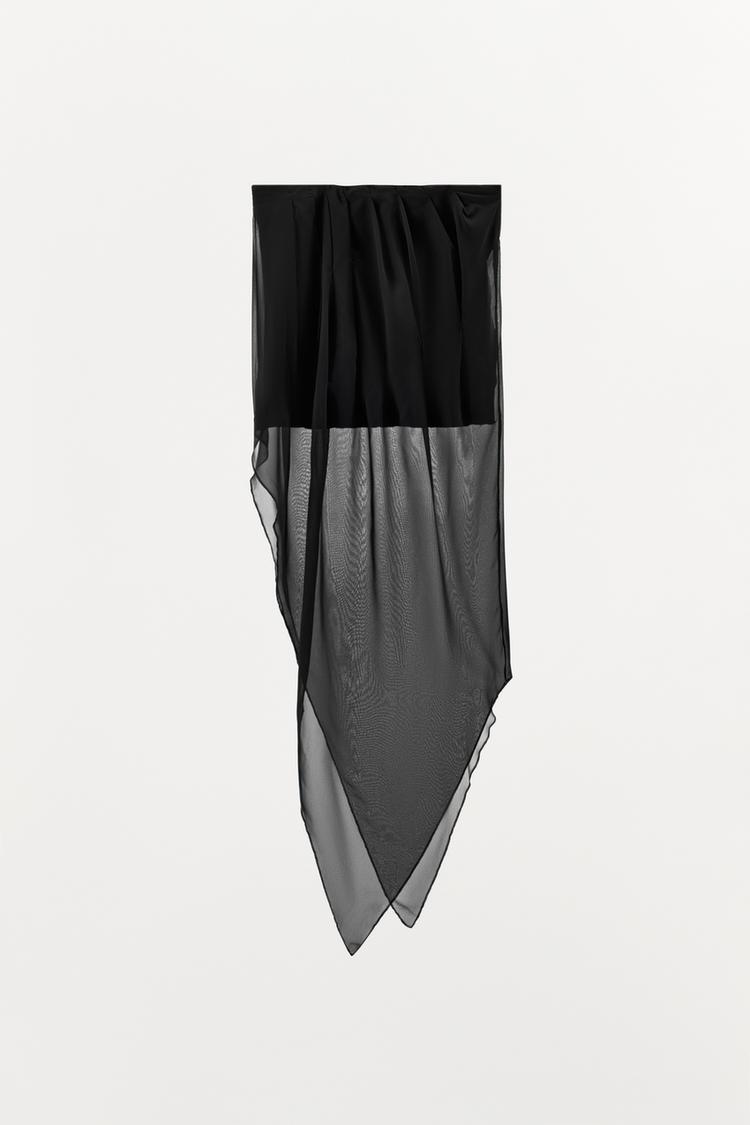Топ без бретелей с внутренней резинкой. Асимметричный полупрозрачный низ из ткани в тон.