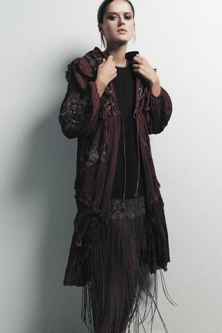 Комбинированный топ из 100% вискозы. V-образный вырез, длинные рукава с регулируемыми завязками. Воланы и бархатистая ткань в тон. Вышивка металлизированной нитью, бисер и контрастные пайетки. Завязки спереди.