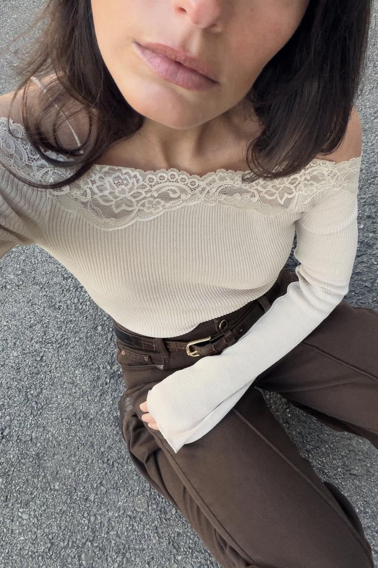 Топ с прямым вырезом, открытыми плечами и длинными рукавами. Кружевные аппликации в тон. Ребристая ткань. Прямой подол.