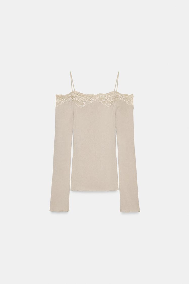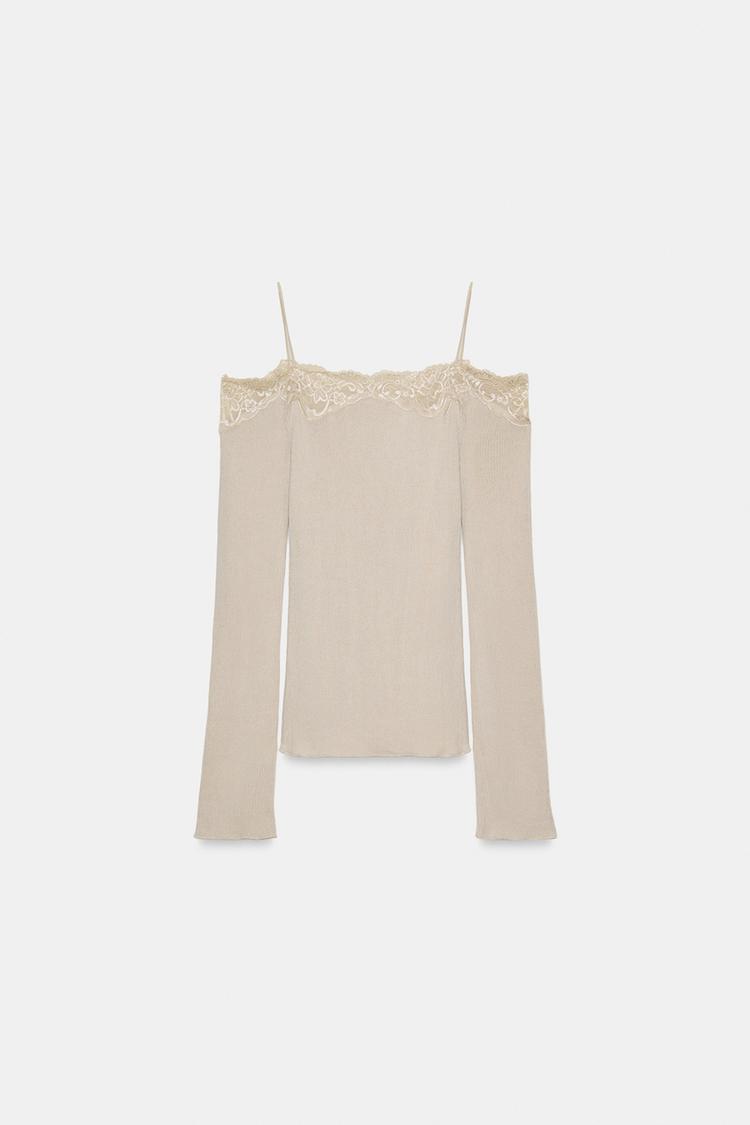 ZARA КОМБИНИРОВАННЫЙ ТОП С ОТКРЫТЫМИ ПЛЕЧАМИ, СВЕТЛО-БЕЖЕВЫЙ