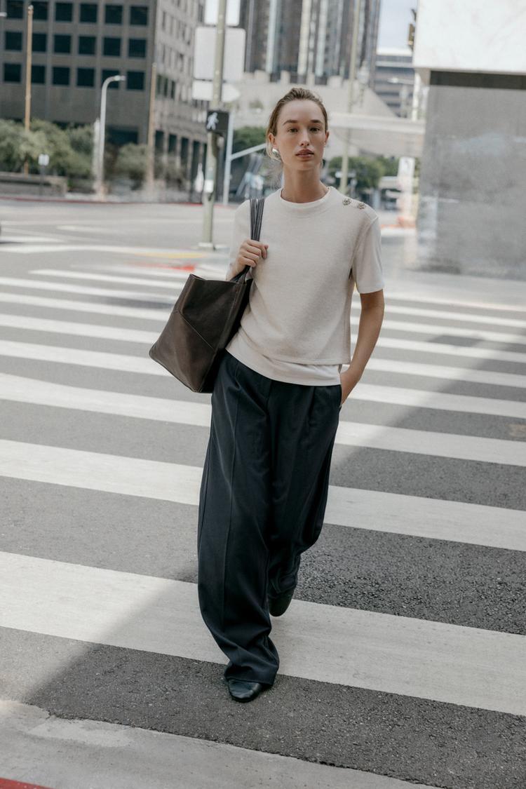 Топ с круглым вырезом и короткими рукавами. Декоративный элемент в виде страз на плече. Комбинация контрастных тканей.