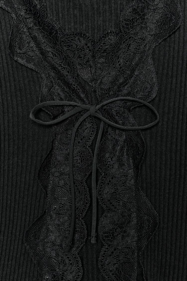 Топ с V-образным вырезом и длинными рукавами. Деталь из кружева в тон. Ткань в рубчик. Застежка спереди на завязках.