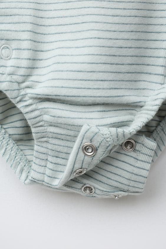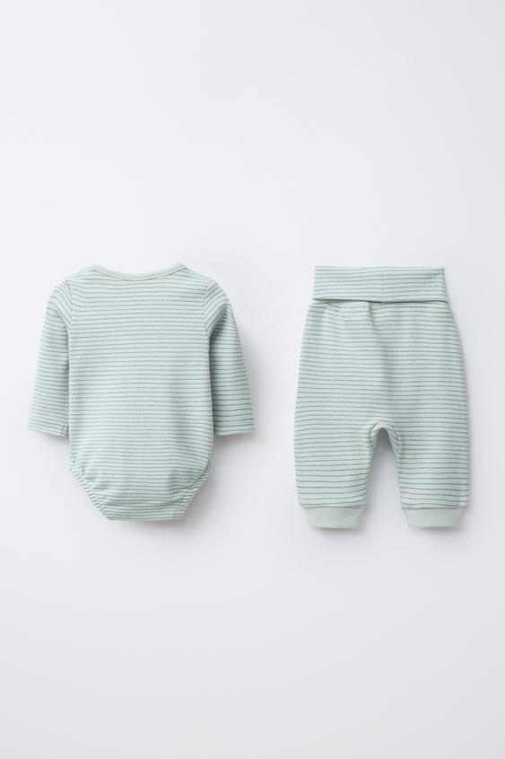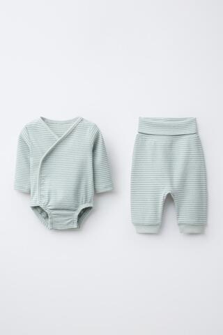 ZARA КОМПЛЕКТ ИЗ БОДИ И БРЮК-ШАРОВАРОВ В ПОЛОСКУ, ЗЕЛЕНОВАТЫЙ
