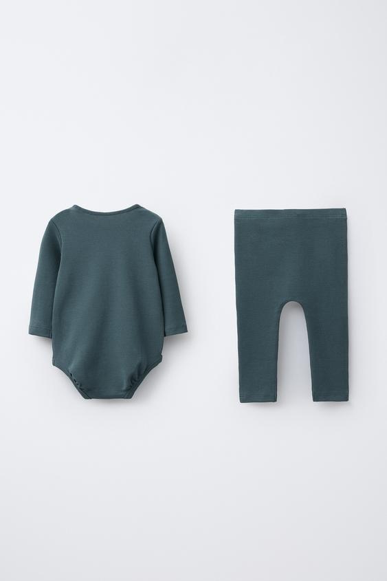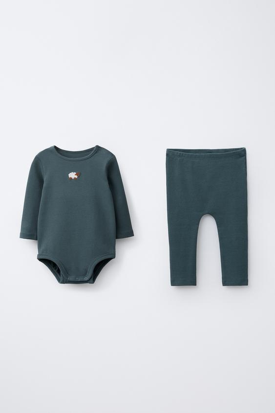 ZARA КОМПЛЕКТ ИЗ БОДИ И ЛЕГГИНСОВ С ВЫШИВКОЙ "ОВЕЧКА", НЕФТЯНОЙ