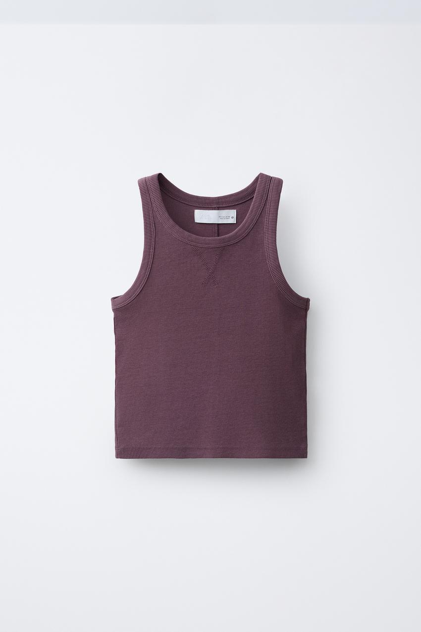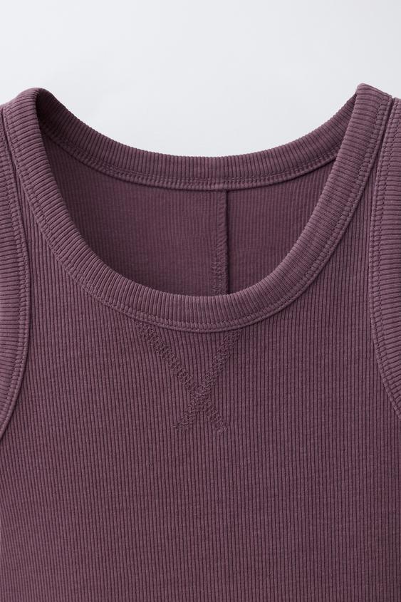ZARA КОМПЛЕКТ ИЗ ФУТБОЛКИ-БОРЦОВКИ И ШОРТОВ В РУБЧИК С ЭФФЕКТОМ ПОТЕРТОСТИ, ПУРПУРНЫЙ