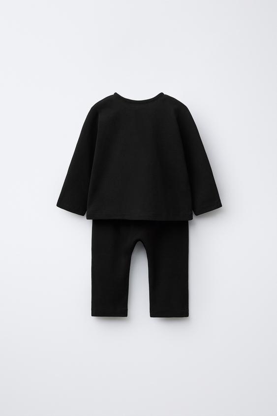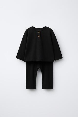 ZARA КОМПЛЕКТ ИЗ ФУТБОЛКИ ХЕНЛИ И ОДНОТОННЫХ БРЮК, ЧЕРНЫЙ