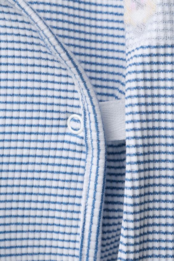 Комплект из двух предметов. Футболка с V-образным вырезом и длинными рукавами. Перекрестная застежка спереди на кнопки. Вышивка цыпленка на груди. Брюки-шаровары с эластичным поясом. Манжеты внизу. Полосатый принт.