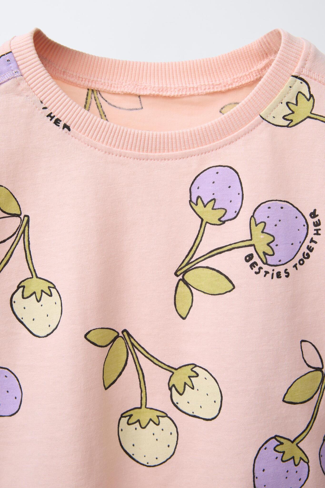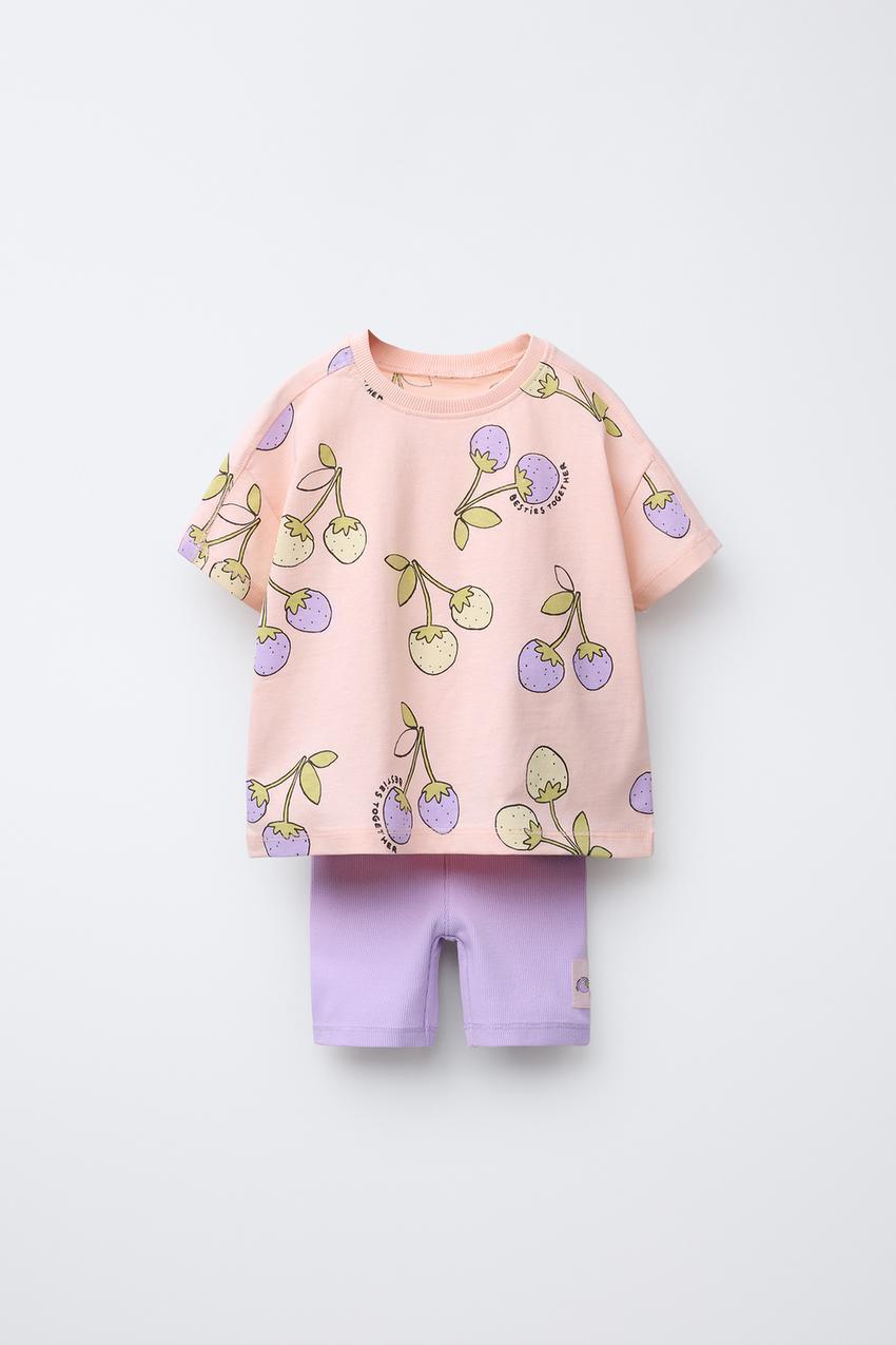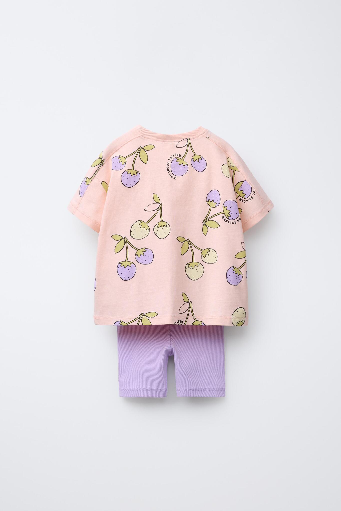 ZARA КОМПЛЕКТ ИЗ ФУТБОЛКИ И ЛЕГГИНСОВ С ПРИНТОМ «ФРУКТЫ», МАНДАРИНОВЫЙ
