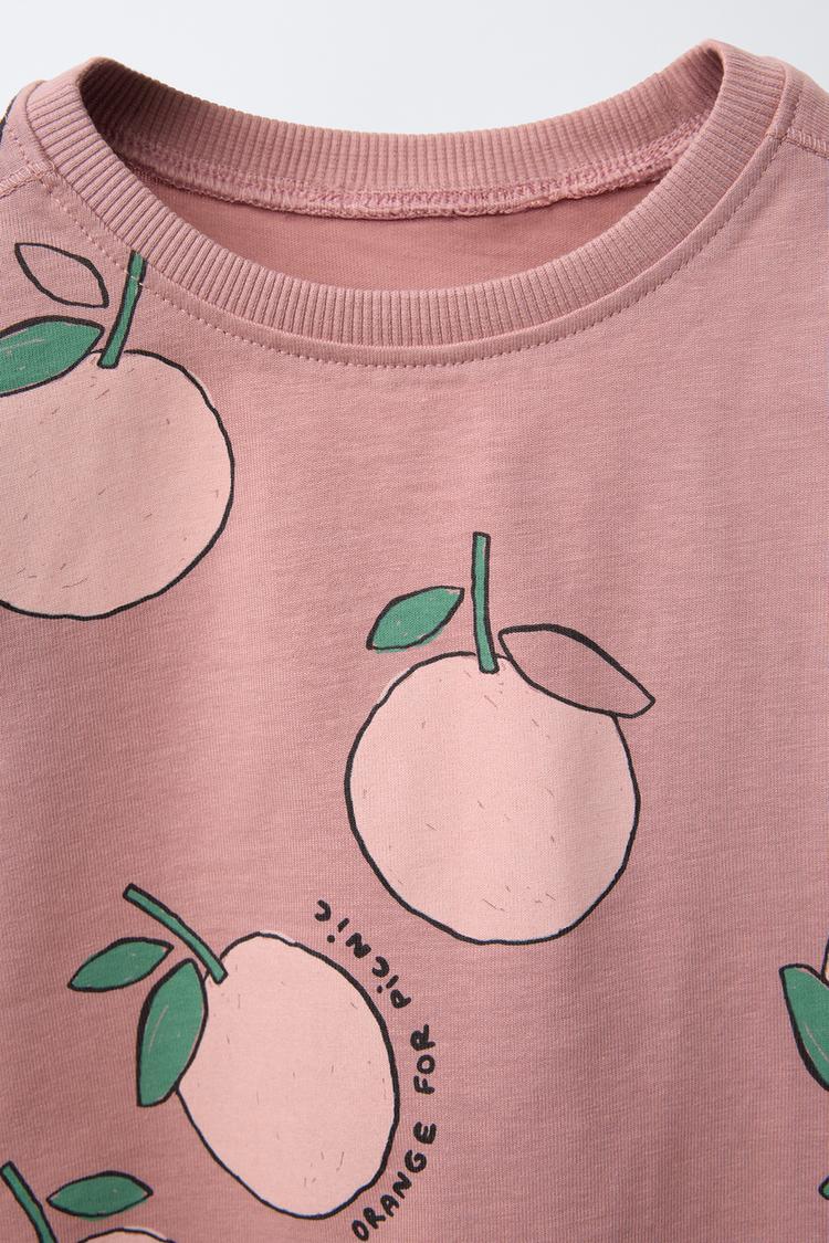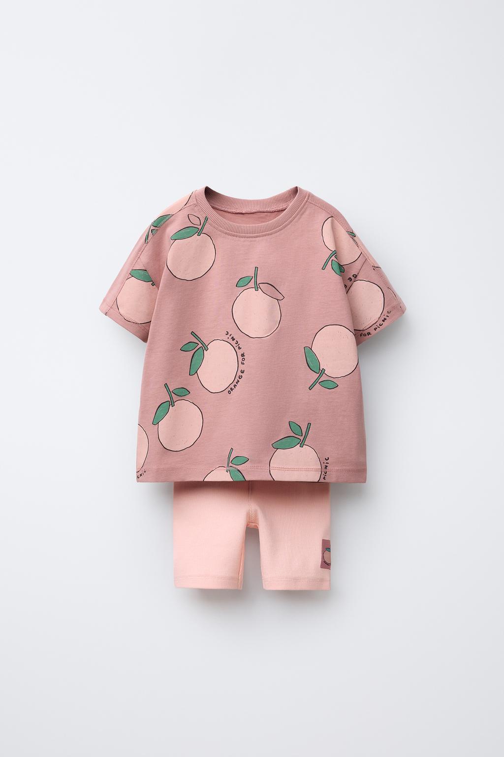 ZARA КОМПЛЕКТ ИЗ ФУТБОЛКИ И ЛЕГГИНСОВ С ПРИНТОМ «ФРУКТЫ», ЦВЕТ МАЛЬВЫ