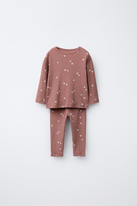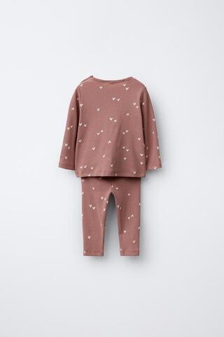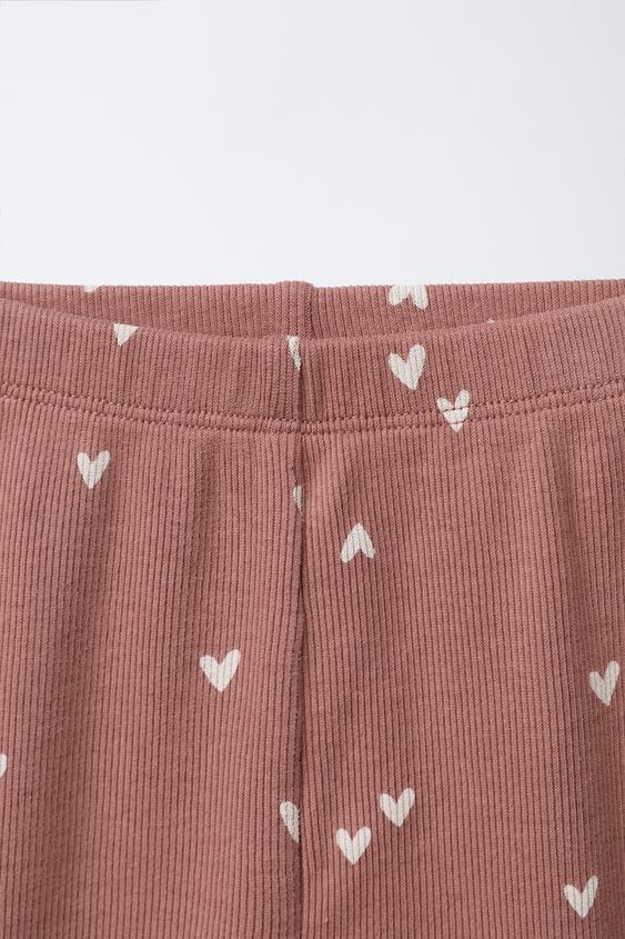 ZARA КОМПЛЕКТ ИЗ ФУТБОЛКИ И ЛЕГИНСОВ В РУБЧИК С СЕРДЕЧКАМИ, РОЗОВЫЙ