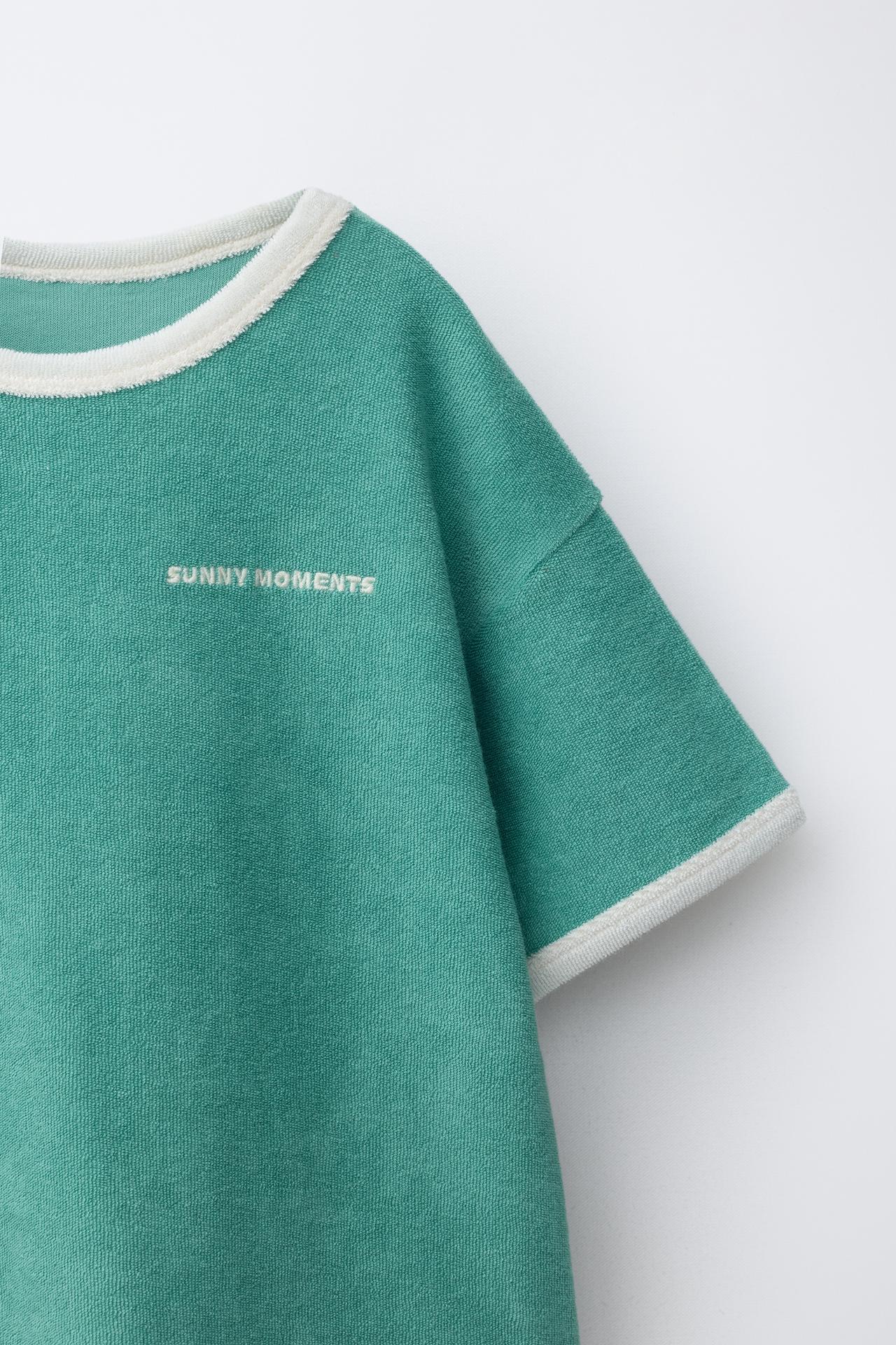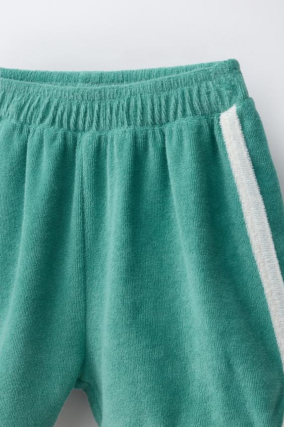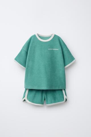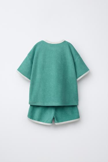 ZARA КОМПЛЕКТ ИЗ ФУТБОЛКИ И ШОРТОВ С ВСТАВКАМИ ИЗ МАХРОВОЙ ТКАНИ, БИРЮЗОВЫЙ