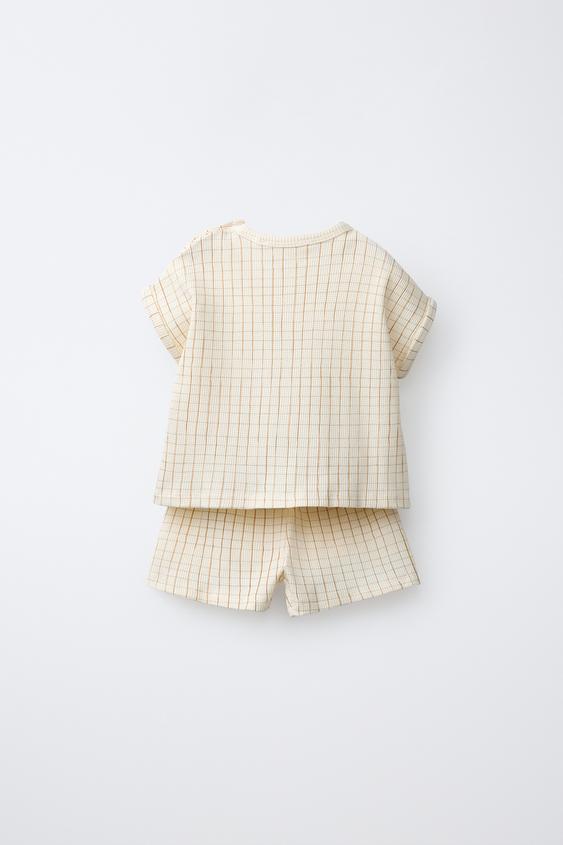 ZARA КОМПЛЕКТ ИЗ ФУТБОЛКИ И ШОРТОВ В КЛЕТКУ, ЭКРЮ