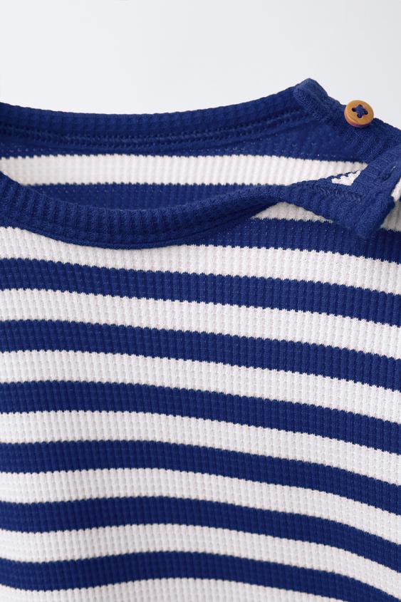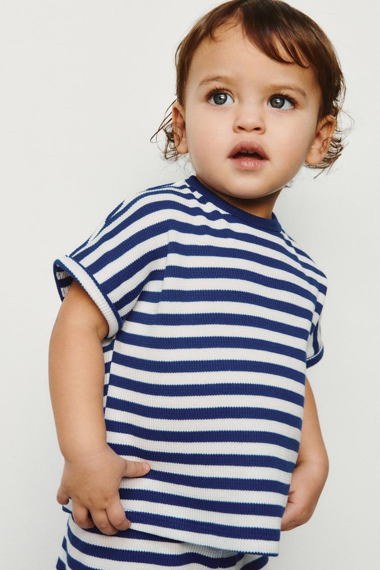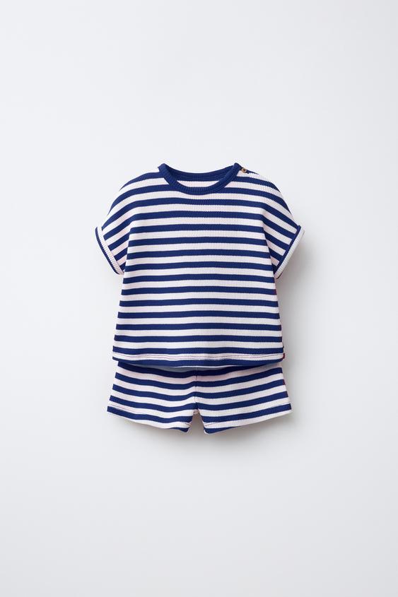 Комплект из двух предметов. Футболка с круглым вырезом и короткими рукавами. Застёжка на пуговицу на плече. Шорты с эластичным поясом. Принт в полоску.