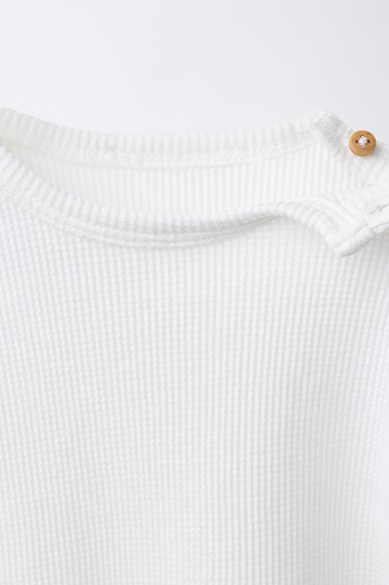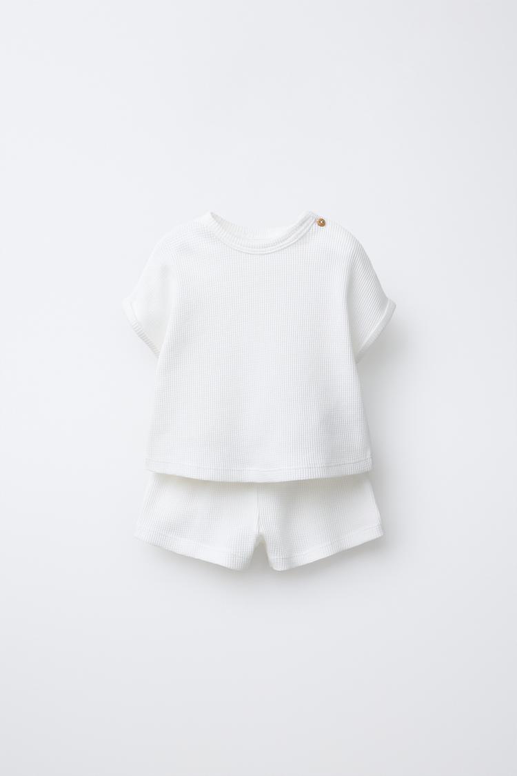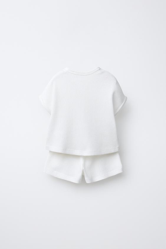 ZARA КОМПЛЕКТ ИЗ ОДНОТОННОЙ ФУТБОЛКИ ИЗ ВАФЕЛЬНОГО ТРИКОТАЖА И ШОРТ-БЕРМУД, ЖЕЛТОВАТО-БЕЛЫЙ