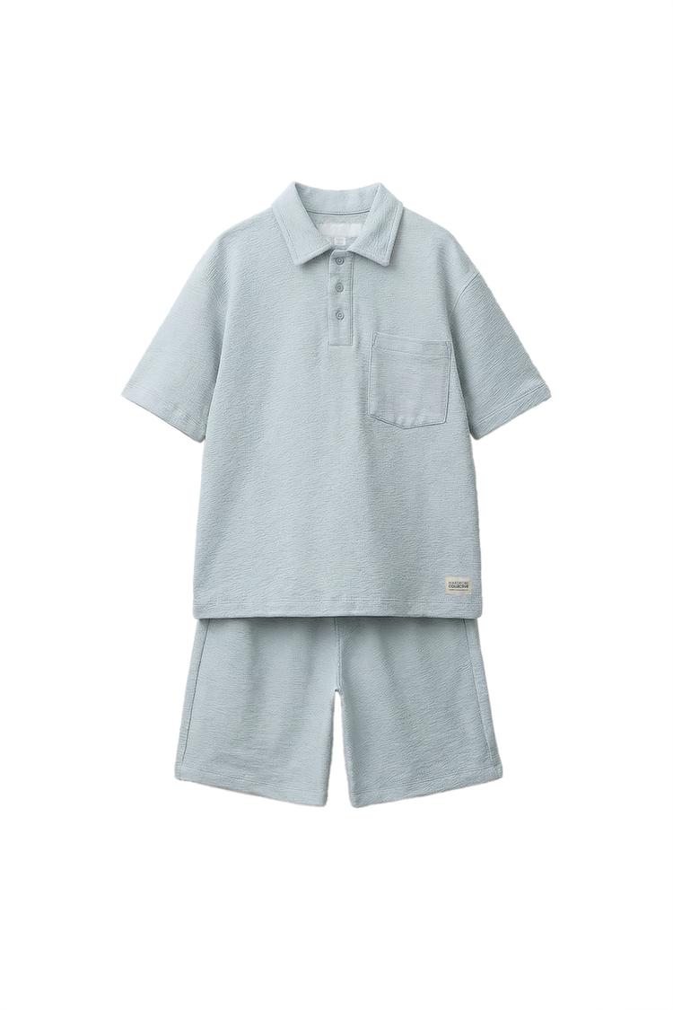 ZARA КОМПЛЕКТ ИЗ РУБАШКИ-ПОЛО И ШОРТ-БЕРМУД ИЗ ГРУБОЙ ТКАНИ С НАШИВКОЙ, НЕБЕСНО-ГОЛУБОЙ