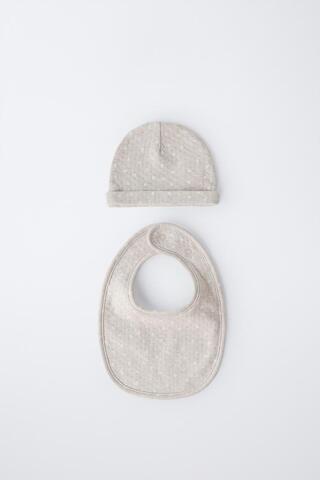 ZARA КОМПЛЕКТ ИЗ ШАПКИ И НАГРУДНИКА С РЕЛЬЕФНЫМ ПРИНТОМ, СЕРЫЙ МЕЛАНЖ