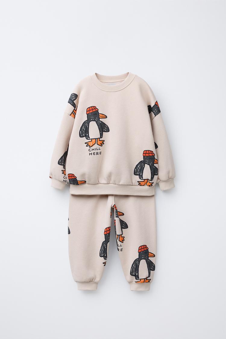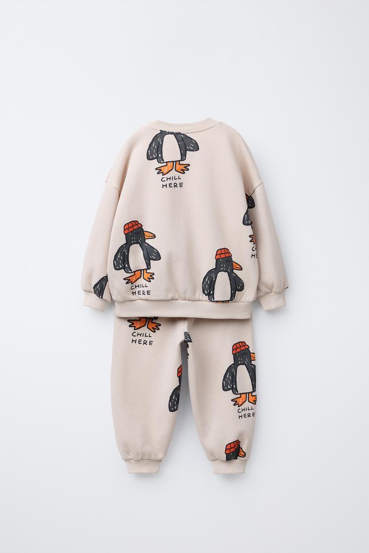 Комплект из двух предметов. Свитшот с круглым вырезом и длинными рукавами. Отделка в рубчик. Брюки-джоггеры с эластичным поясом и манжетами. Теплая и мягкая внутренняя ткань с начесом. Принт с пингвинами.