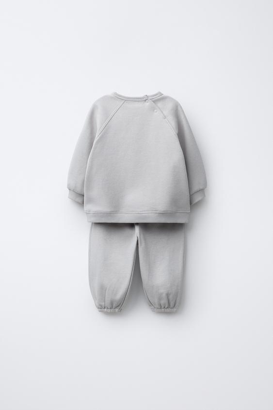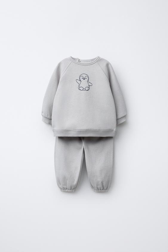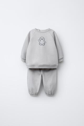 ZARA КОМПЛЕКТ ИЗ ТОЛСТОВКИ И БРЮК-ДЖОГГЕРОВ С ВЫШИВКОЙ ПИНГВИНА, ЖЕМЧУЖНО-СЕРЫЙ