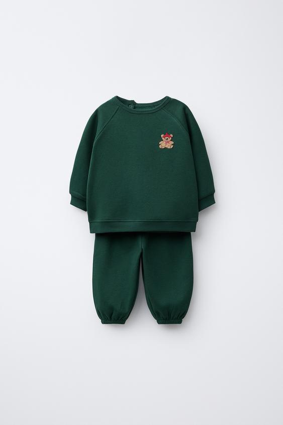 ZARA КОМПЛЕКТ ТОЛСТОВКА С МАХРОВОЙ НАШИВКОЙ И БРЮКИ-ДЖОГГЕРЫ, МЯГКИЙ ЗЕЛЕНЫЙ