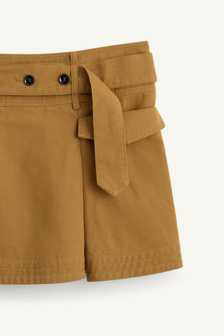 Короткая юбка из хлопка. Средняя талия и пояс с перемычкой. Платёжные карманы с боковыми клапанами. Регулируемый пояс на пуговицах. Детали плиссировки.