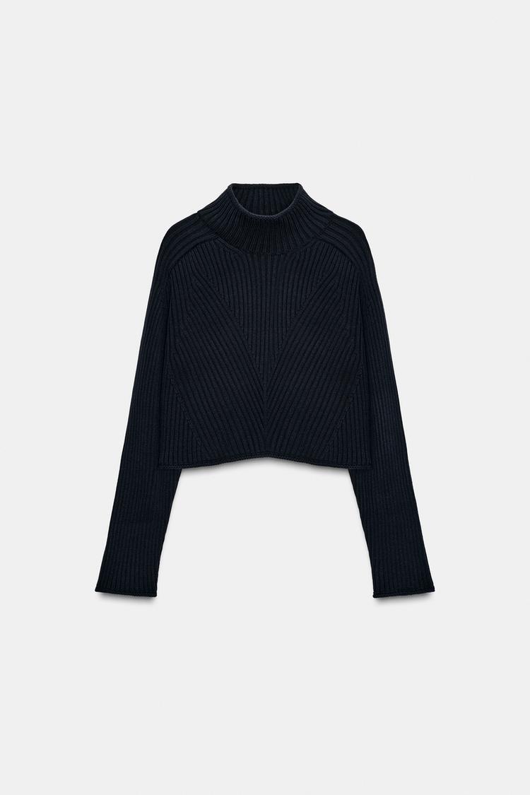 Короткий джемпер с воротником-стойкой и длинными рукавами.