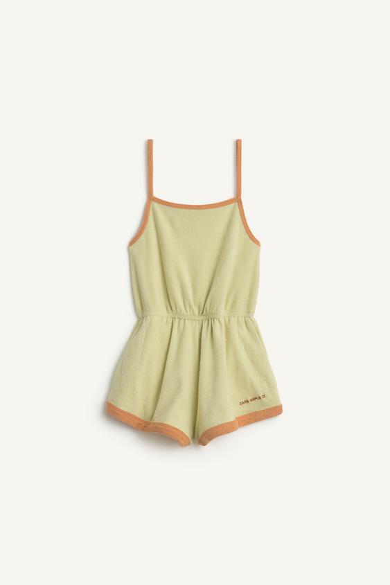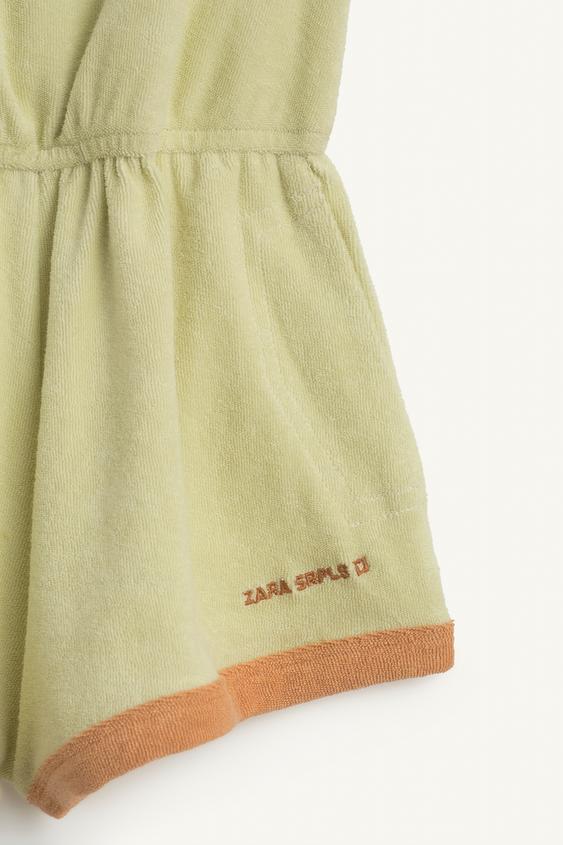Короткий комбинезон из махровой ткани с круглым вырезом горловины и бретелями. С передними карманами, эластичным поясом и контрастной цветной окантовкой.