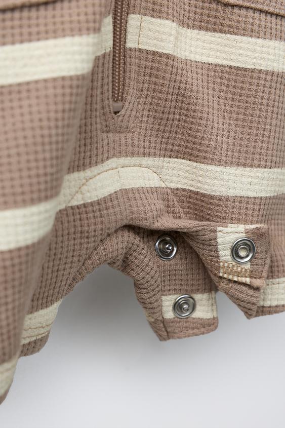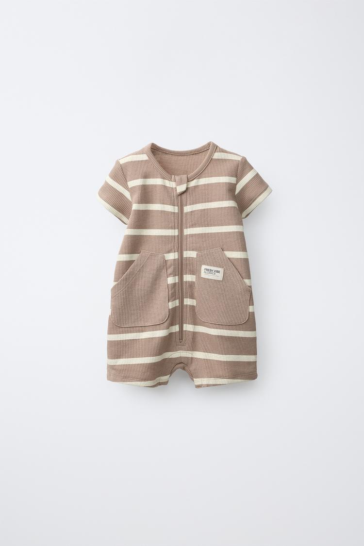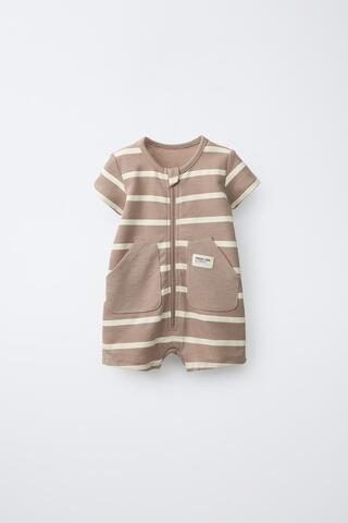 Короткий комбинезон с круглым вырезом и короткими рукавами. Застежка-молния спереди и кнопки снизу. Накладные карманы спереди с этикеткой. Полосатый принт.