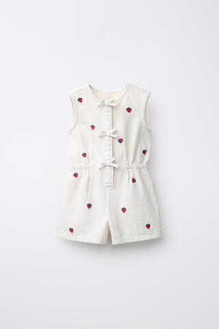 ZARA КОРОТКИЙ КОМБИНЕЗОН ИЗ САРЖИ С ВЫШИВКОЙ КЛУБНИКИ, ЭКРЮ