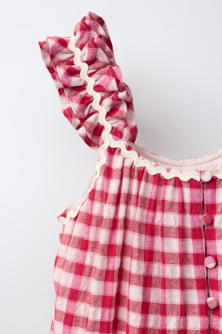 ZARA КОРОТКИЙ КОМБИНЕЗОН В КЛЕТКУ С ВОЛНИСТЫМ КРАЕМ, РОЗОВЫЙ/БЕЛЫЙ