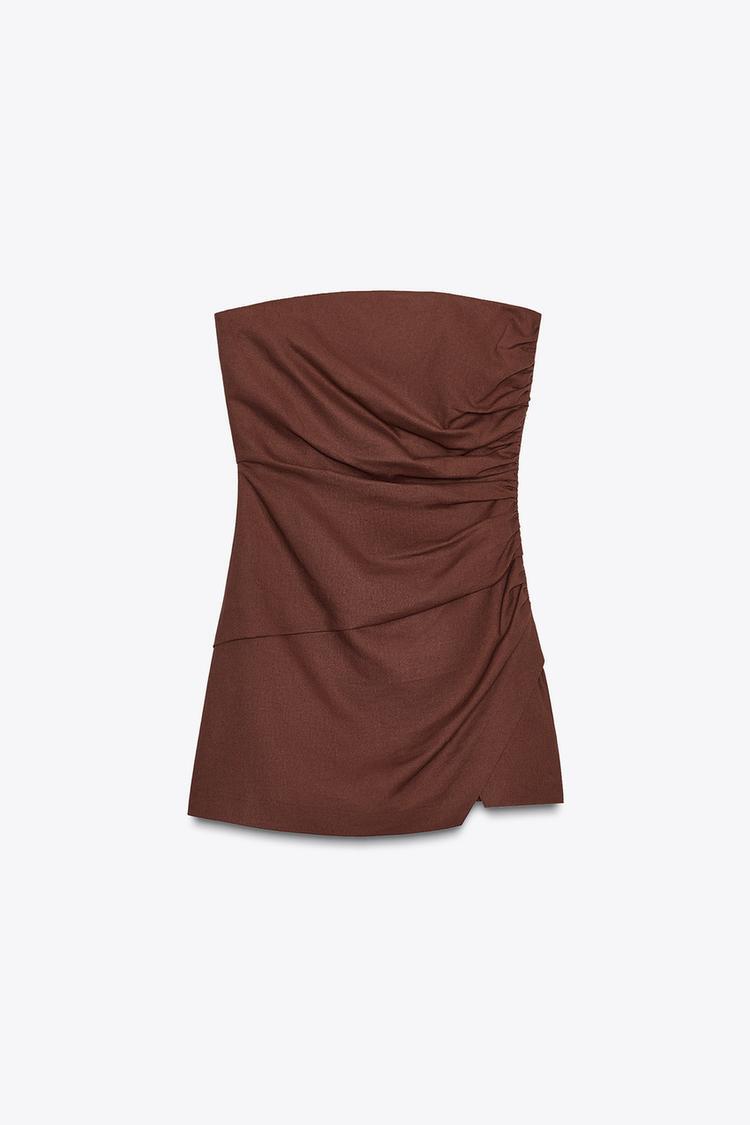 Короткий комбинезон из льна. Прямой вырез и открытые плечи. Боковые сборки и разрез снизу. Застежка на потайную молнию сзади.