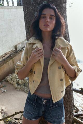 Короткий тренч с воротником с лацканами. Широкие рукава длиной ниже локтя с отворотами и хлястиками. Передние прорезные карманы. Застегивается на пуговицы.