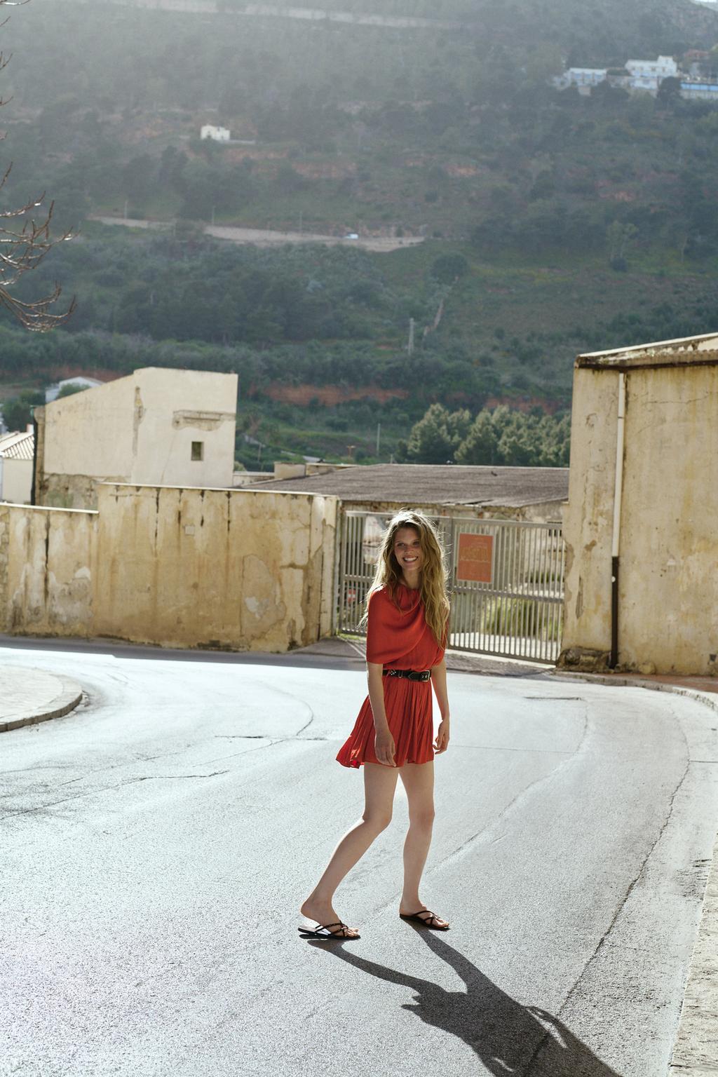ZARA КОРОТКОЕ АСИММЕТРИЧНОЕ ПЛАТЬЕ С ПОЯСОМ, ТЕМНЫЙ ЧЕРЕПИЧНЫЙ