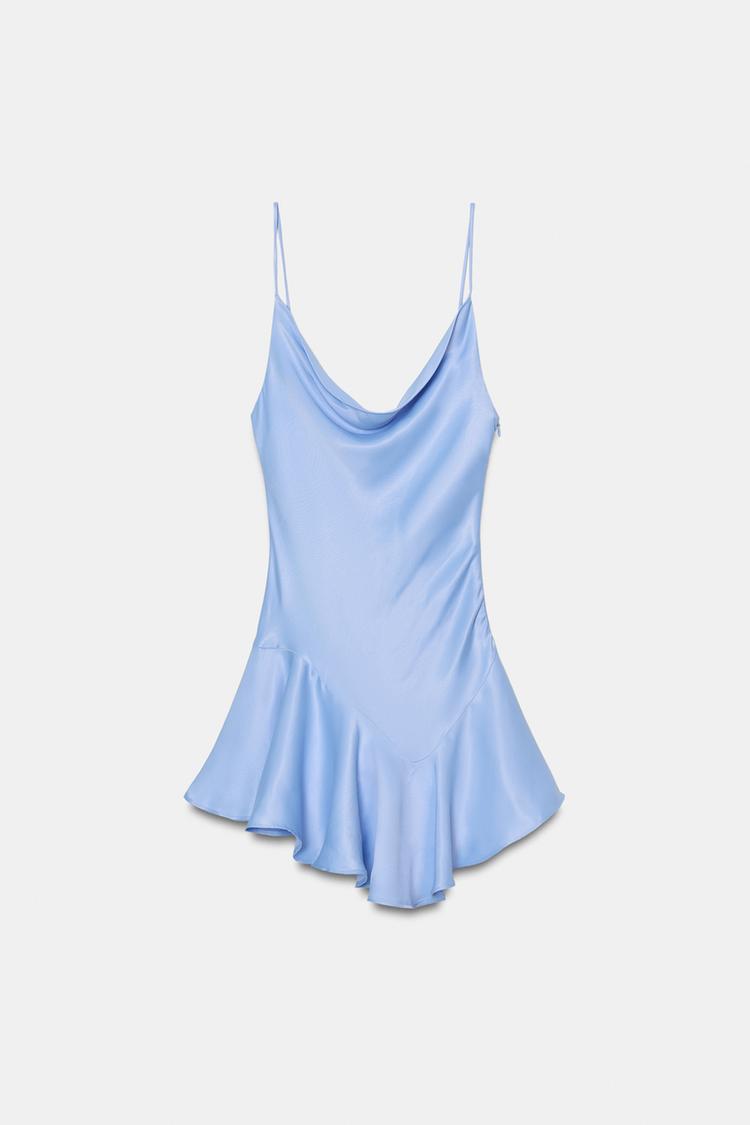 ZARA КОРОТКОЕ АТЛАСНОЕ ПЛАТЬЕ С АСИММЕТРИЧНЫМ НИЗОМ, НЕБЕСНО-ГОЛУБОЙ