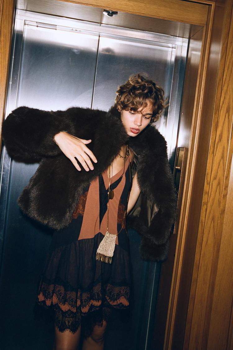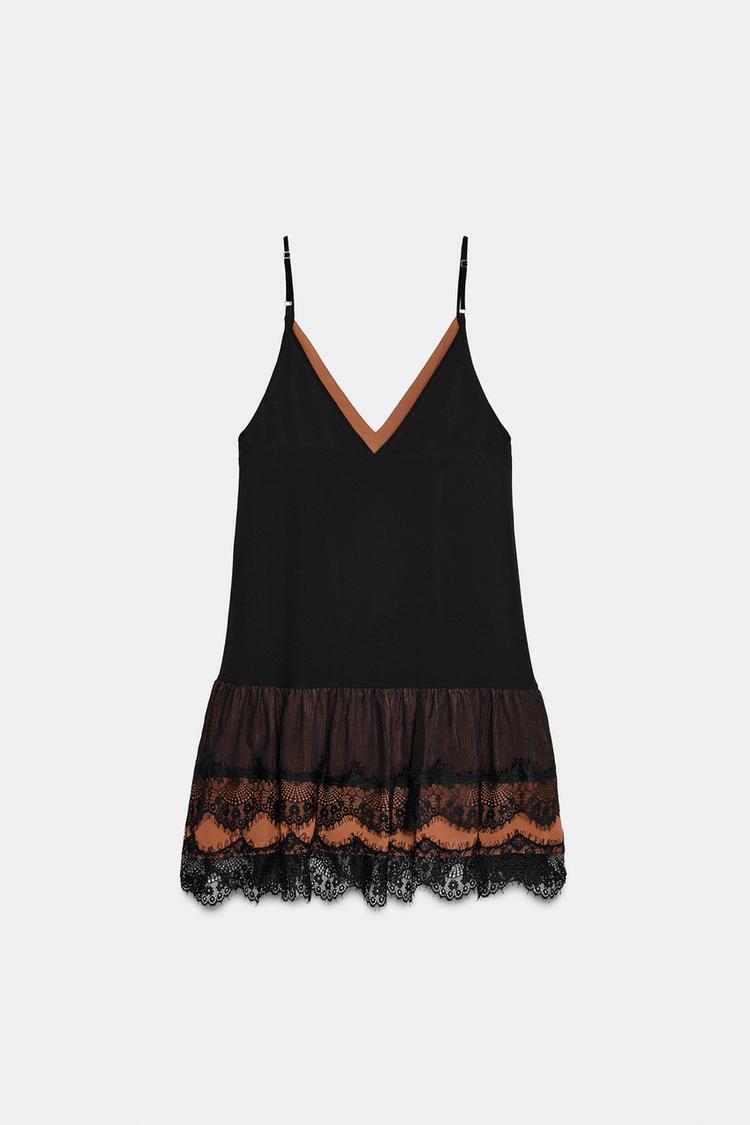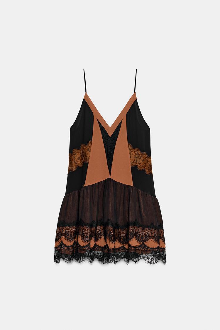 ZARA КОРОТКОЕ КОМБИНИРОВАННОЕ ПЛАТЬЕ С КРУЖЕВОМ, ЧЕРНЫЙ/КОРИЧНЕВЫЙ