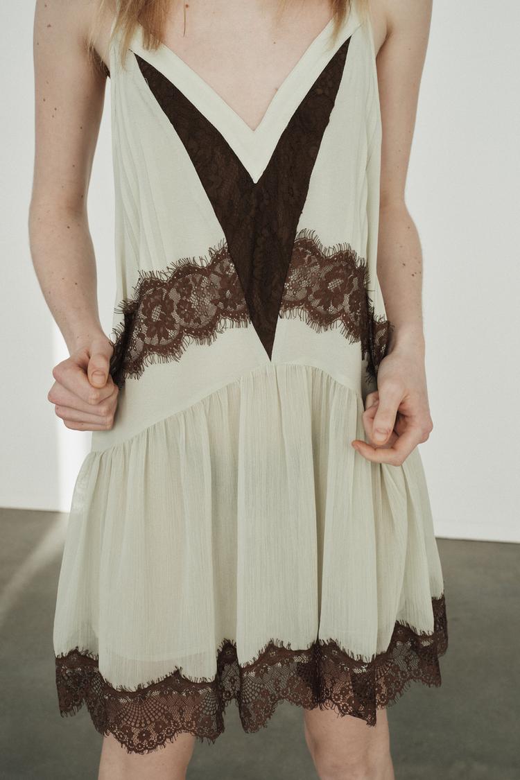 Короткое платье с V-образным вырезом и тонкими регулируемыми бретельками. Контрастная кружевная отделка. Внутренняя подкладка.