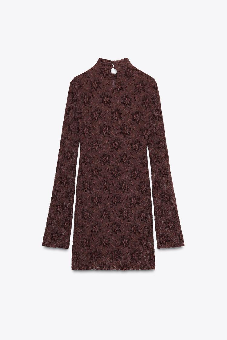 ZARA КОРОТКОЕ КРУЖЕВНОЕ ПЛАТЬЕ, БОРДОВЫЙ