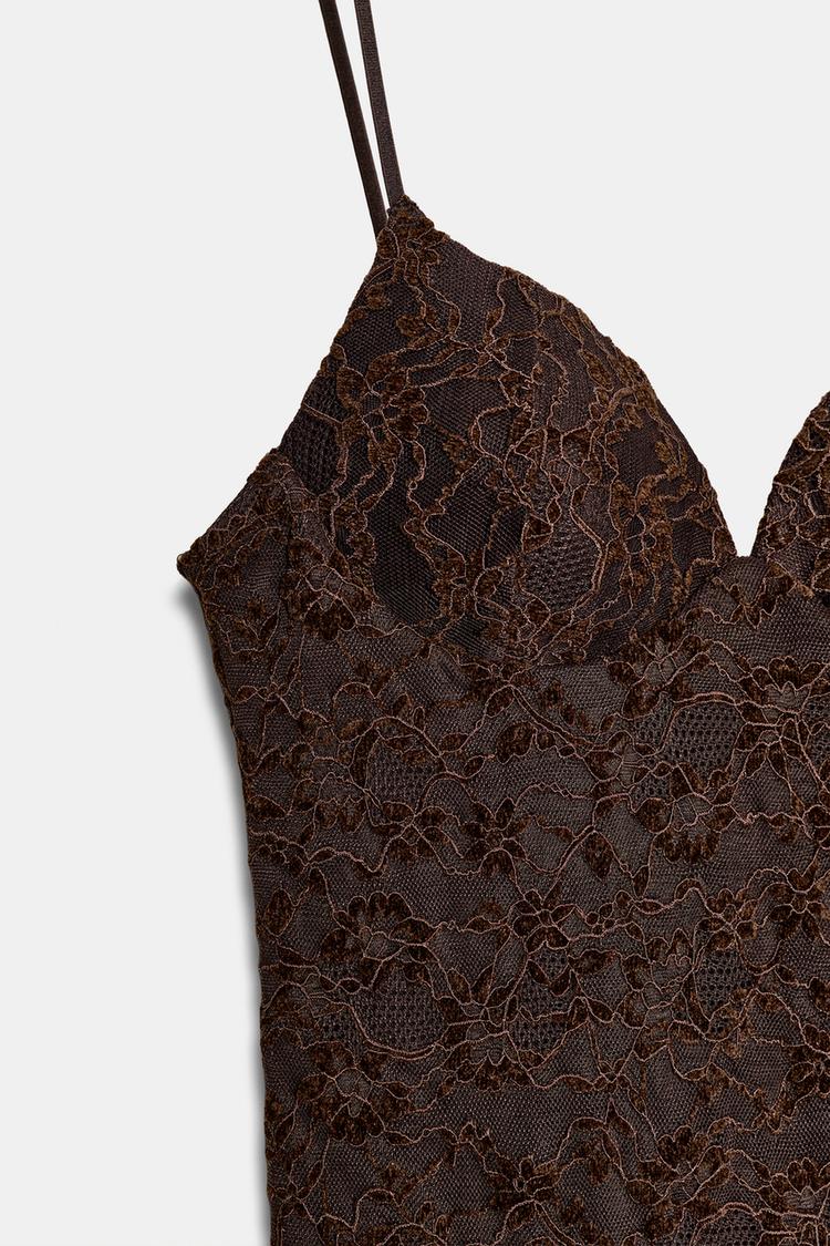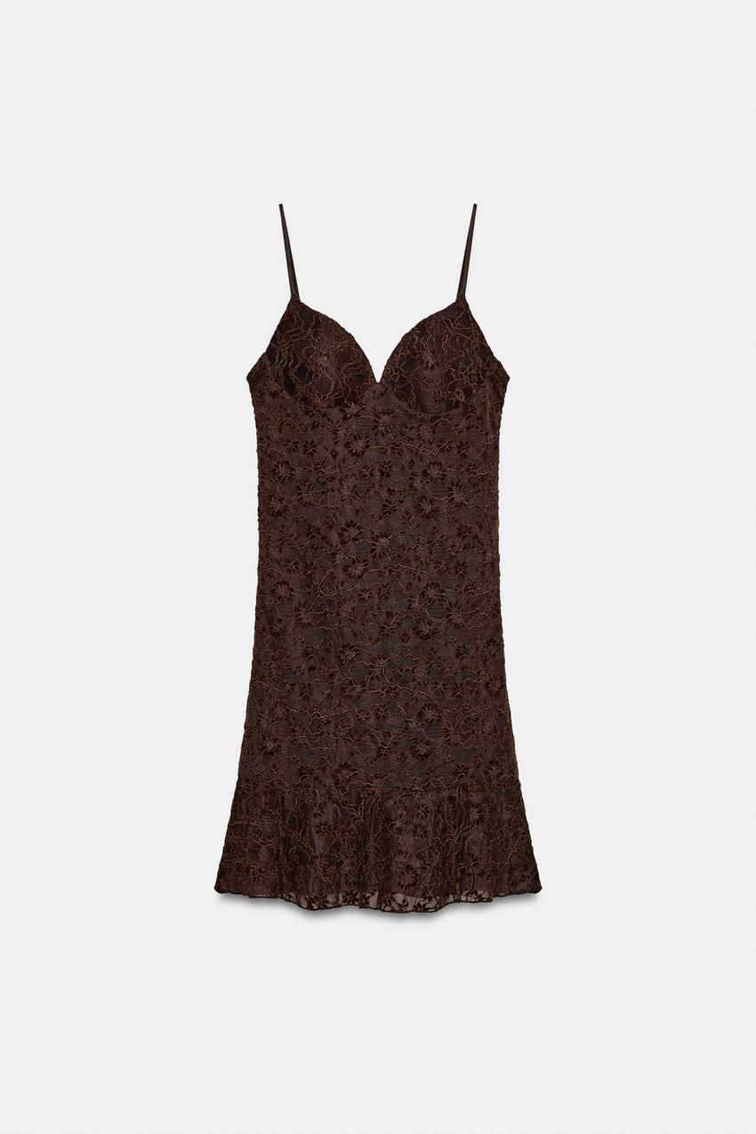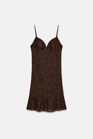 ZARA КОРОТКОЕ КРУЖЕВНОЕ ПЛАТЬЕ, ТЕМНО-КОРИЧНЕВЫЙ